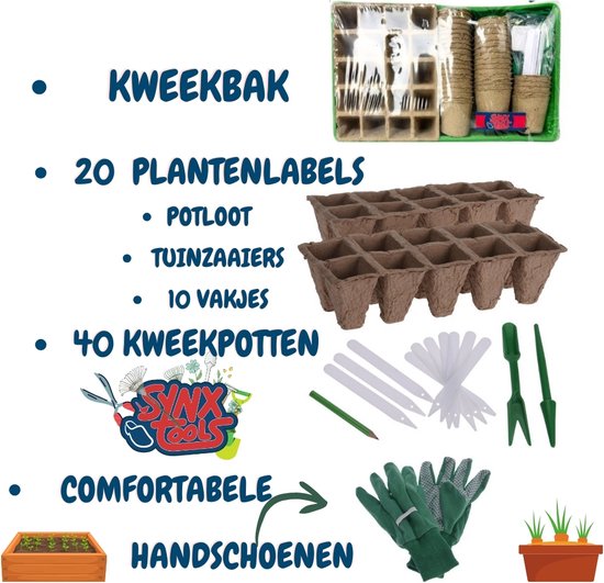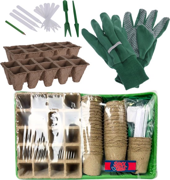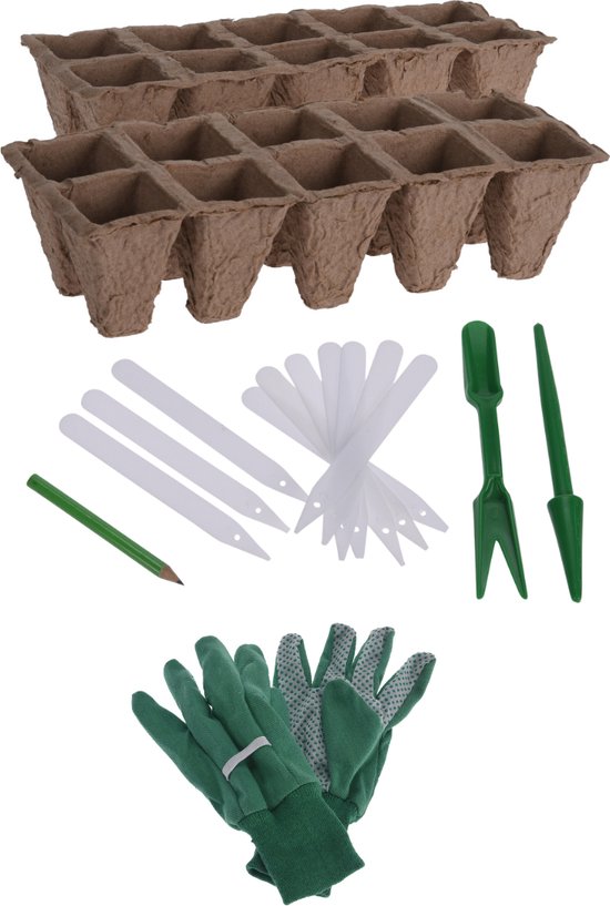 Le set comprend deux plateaux de semis avec 10 alvéoles chacun, 40 pots de culture, des gants de jardinage confortables, 20 étiquettes pour plantes et des outils de semis pratiques. Ce plateau de semis est parfait pour démarrer ou agrandir votre potager sur le rebord de fenêtre. Les plateaux vous aident à organiser vos semences, tandis que les étiquettes permettent un étiquetage clair.